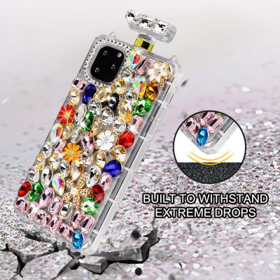 Cube® - Apple iPhone 11 Pro Max - Premium Clear TPU Perfume Bottle Shape Case with Floral Pieces Multicolor Large Rhinestone with Detachable Strap