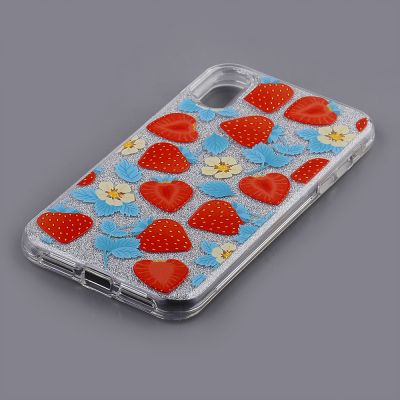 Cube® - Apple iPhone Xs Max - Strawberry and Flower Design on PC Hard Cover with Clear TPU and Silver Glitter Insert
