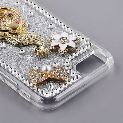 Cube® - Apple iPhone 8 / iPhone 7 / iPhone 6s / iPhone 6 - Glitter and Rhinestones with Peacock Ring Stand and Flower Embellishments on PC Back Cover with Clear TPU Edge in Premium Packaging